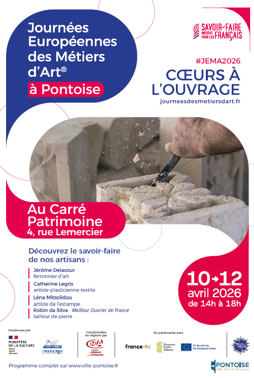 Du vendredi 10 au dimanche 12 avril, Pontoise prendra part aux Journées européennes des mé-tiers d’art (JEMA), un grand ren-dez-vous consacré aux sa-voir-faire artisanaux, organisé chaque printemps en France et dans plusieurs pays d’Europe. Les JEMA invitent le public à dé-couvrir des métiers souvent mé-connus, à rencontrer celles et ceux qui les font vivre et à mieux comprendre la place de ces gestes dans notre patrimoine vi-vant.